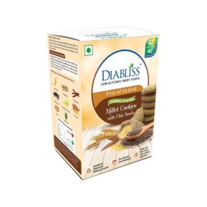 Diabliss Millet Cookies with Chia Seeds offer the many benefits of chia seeds in a delightfully tasting cookie. This delicious snack is composed of whole wheat grains – Barnyard and Kodo millets. Whole wheat grains have benefits such as decreasing undesired feeding urges and binge eating bouts because of the presence of soluble fibre. Fibre enhances satiety and the feeling of fullness. Millets also score over other grains such as rice, flour and wheat because of their extraordinary fibre content and nutrients.